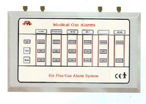 Alarm body is made out of powder coated MS sheet of 18 gauge size.Box size:- LxWxH 12”x7”x4”.Test function is provided in the Line Pressure Alarm system to test the audio-visual indicators. On pressing the Test Button, all the emergency indicators i.e. the High and the Low indicators start glowing along with a beep alarm. This test is performed for 5 seconds and after that it comes back to its previous position. Alarm has provision to install upto 6 no. of gases. Mute Function is provided for switching off the beep alarm whenever it blows. The system is provided with a timer, which allows the beep alarm to restart after 10 minutes of pressing the mute button. LED window size 10mmx20mm. Complies with HTM 2022 Std. |
